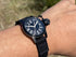 Reconとは英語のスラングで、フランス語起源の英単語"reconnaissance"の略です。主に軍事的な⽂脈で使われ、敵の動向や地形などを偵察することを指します。まさにUDTの任務ですね。につきにくい⿊⽂字盤にグレイのインデックスが知的な趣がありとてもクールです。針蓄光部分もグレイ⾊でインデックスと合わせており、ブラックボディや⽂字盤とマッチします。全体的にシックな⾯持ちです。