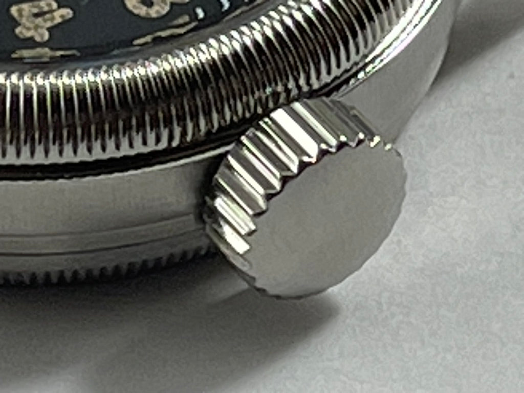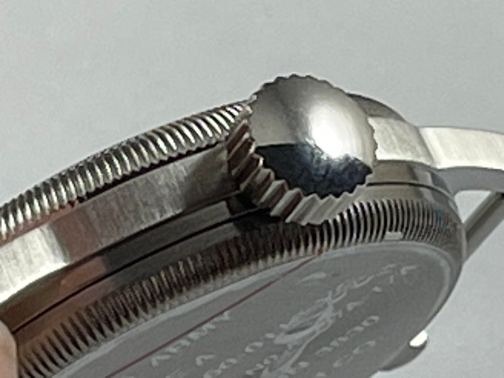 32mmサイズの小ぶりな時計にしては大きめのリュウズ。手袋をしているパイロットにとって操作のしやすい大きなリュウズを採用しています。