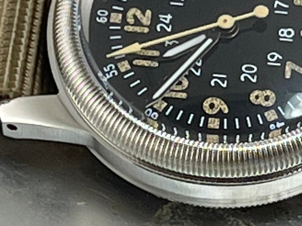 風防周りのベゼルはコインエッジ加工が施されています。コインエッヂ加工はパイロットが文字盤周りの金属が光の反射によって文字盤を見にくくするのを避けるため配置しています。